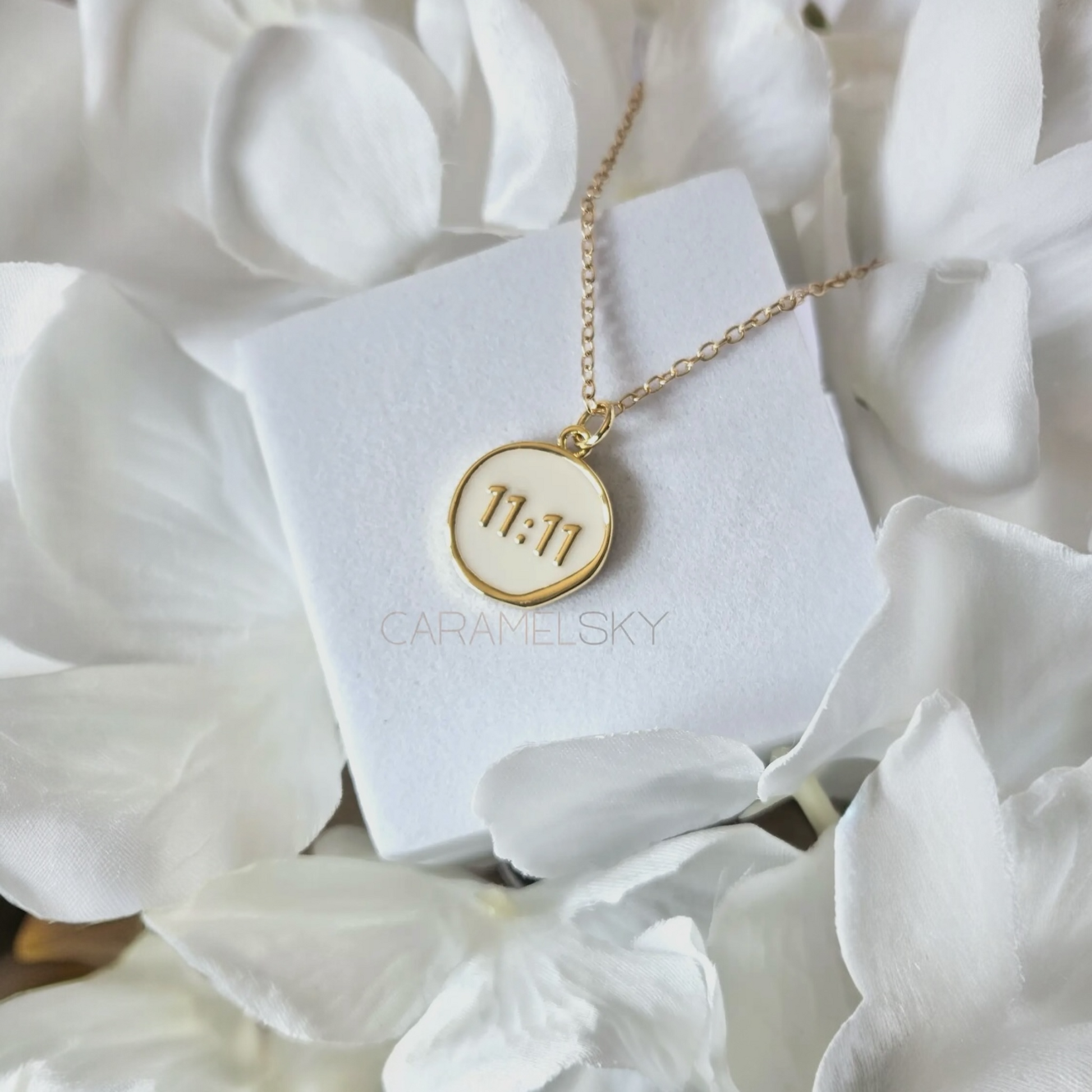 A delicate 18K gold-plated 11:11 pendant with white enamel on a hypoallergenic stainless steel chain. Simple, meaningful, and everyday ready.