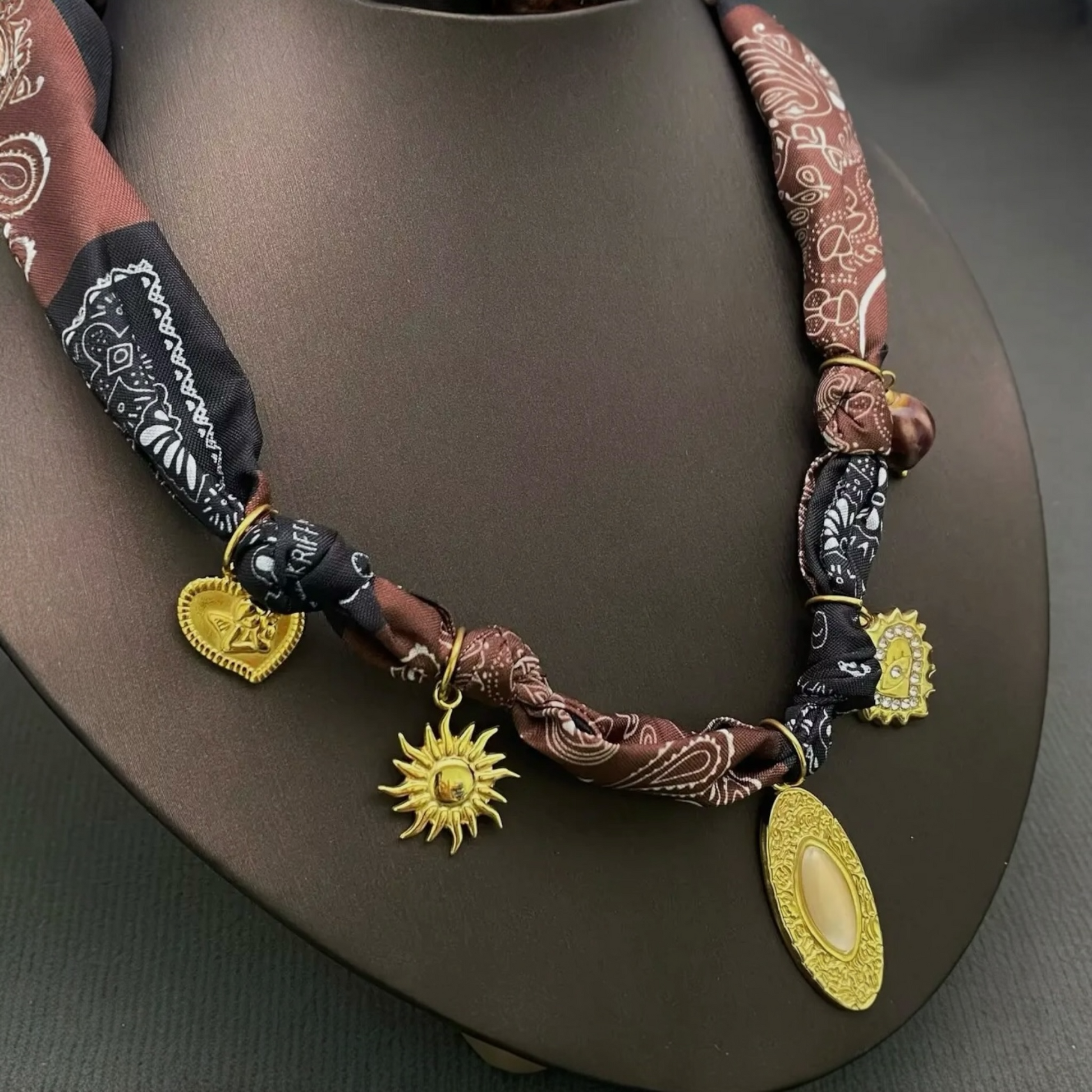 A chic pendant necklace featuring a stylish scarf detail, adding a modern twist to a classic look. Perfect for gifting or elevating any outfit.
