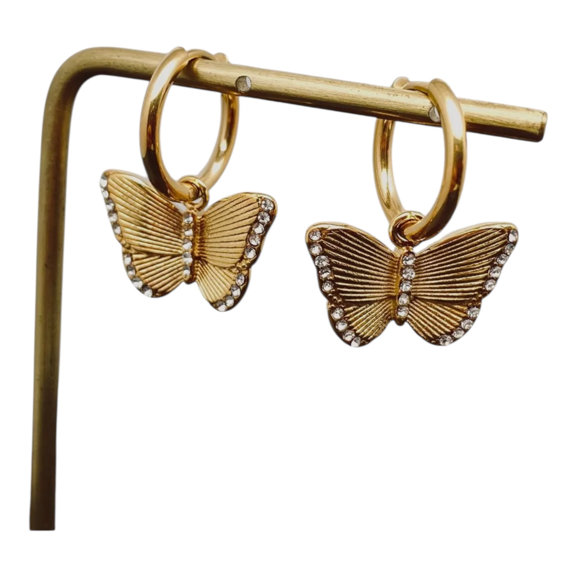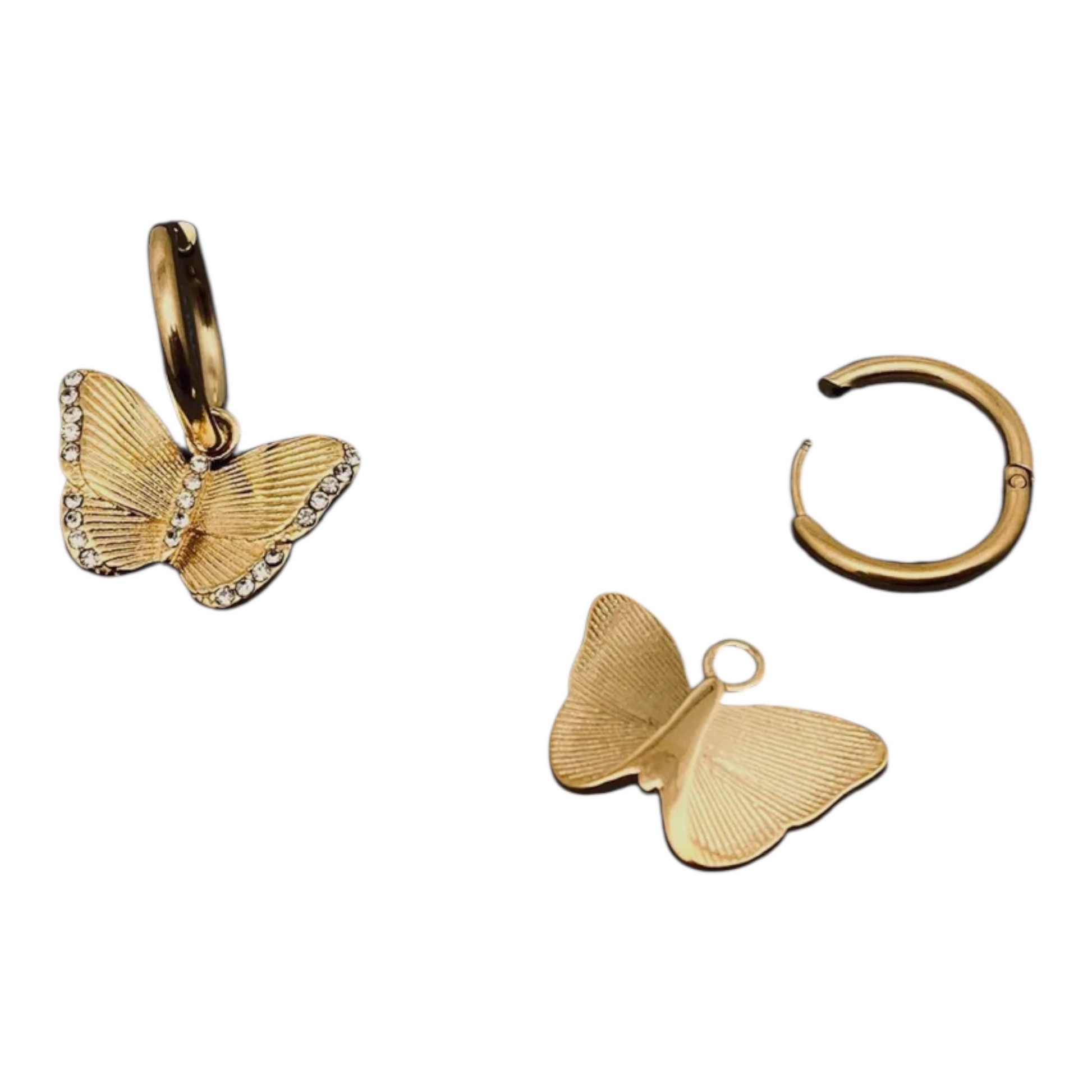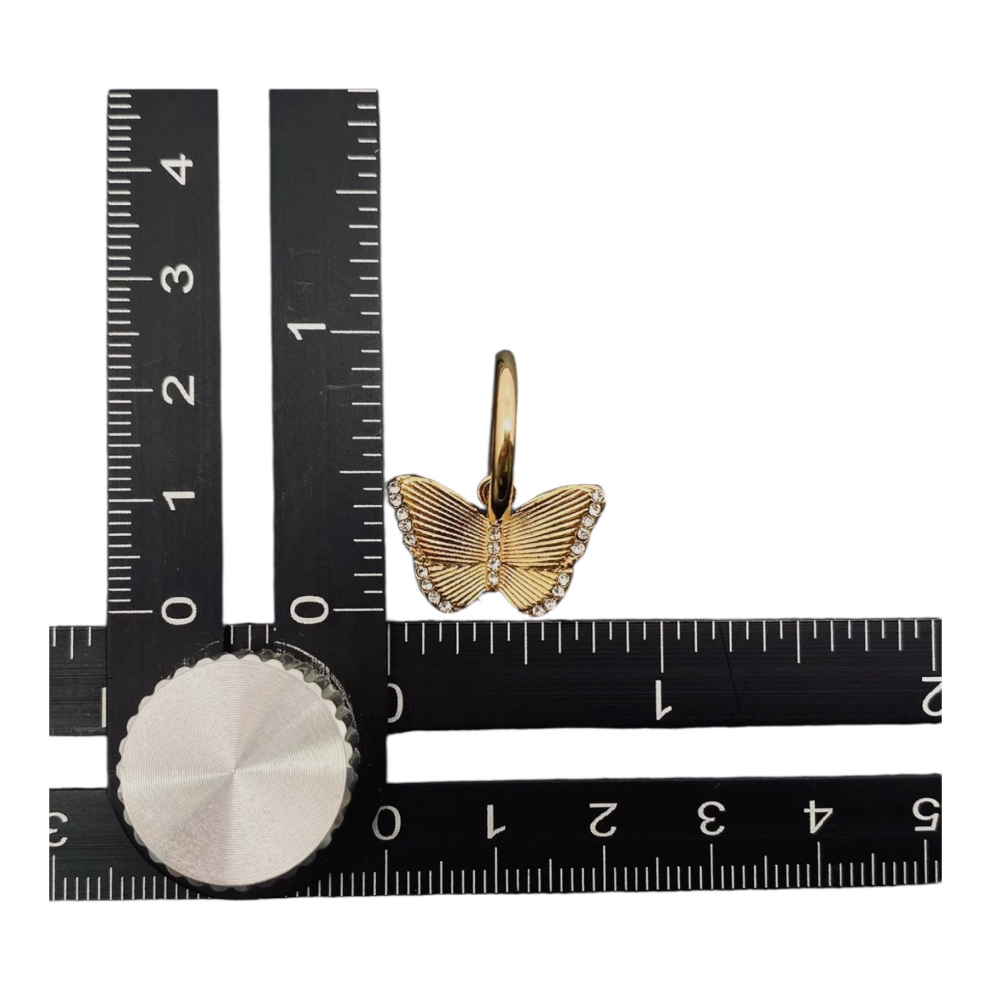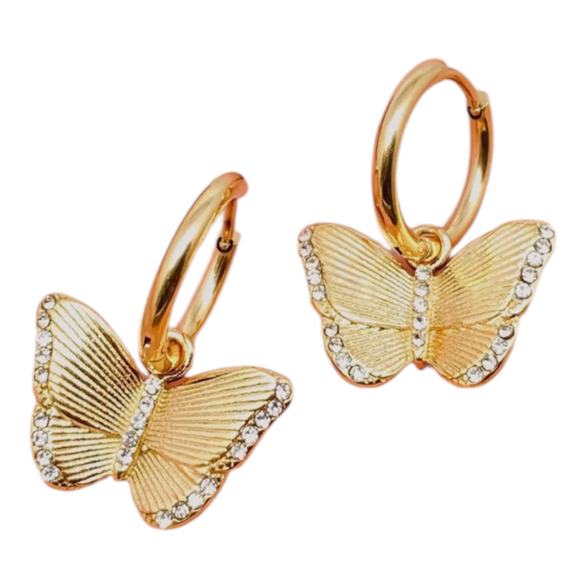 Delicate 18K gold-plated stainless steel huggies adorned with sparkling cubic zirconia butterfly charms. Lightweight, hypoallergenic, and perfect for everyday wear or gifting.