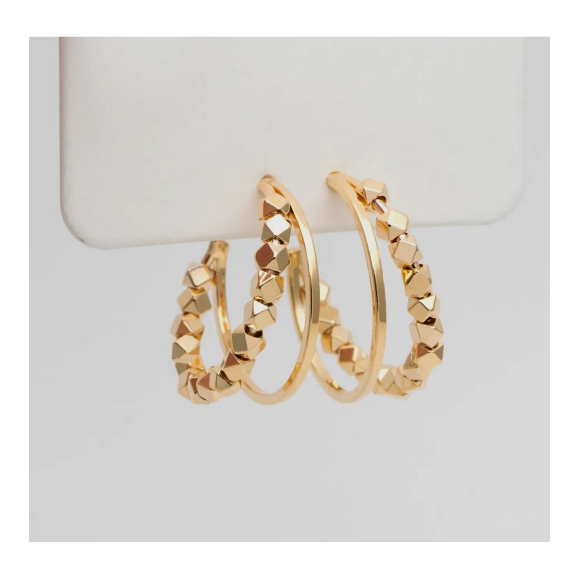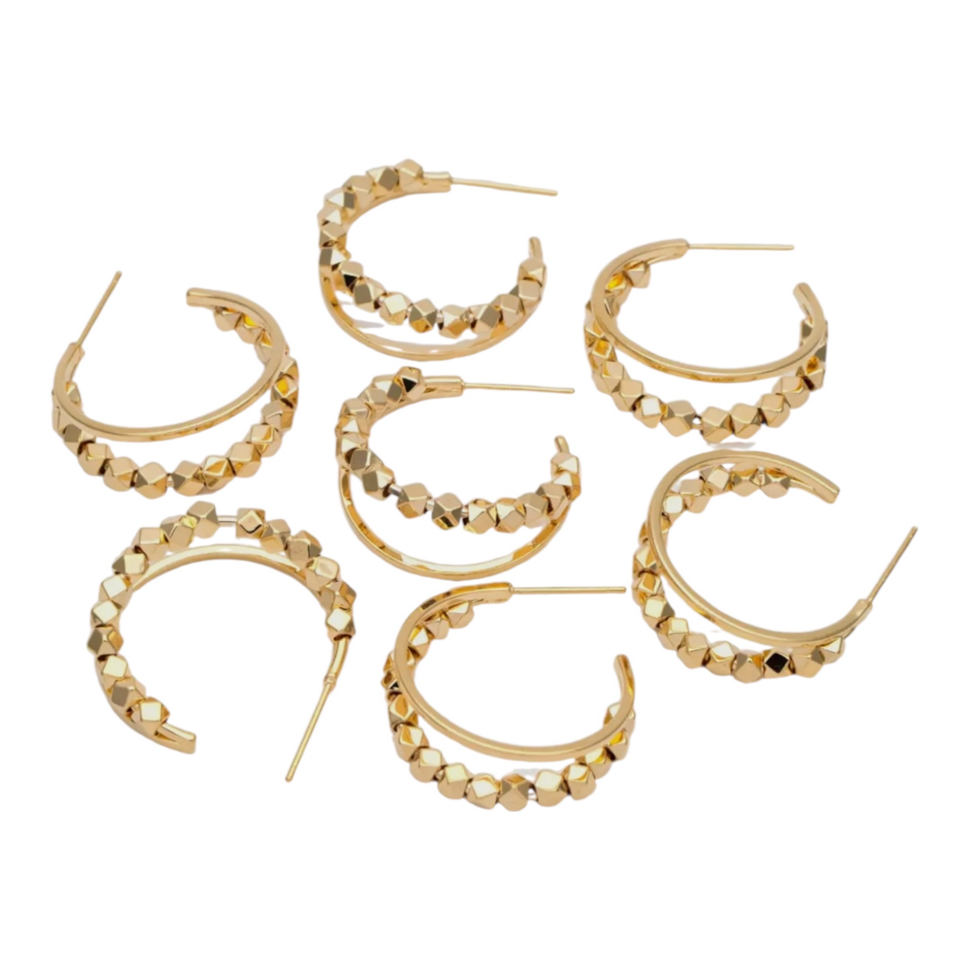 Lightweight, non-tarnish hoop studs with a modern double-beaded design. Crafted from hypoallergenic, 18k gold plated stainless steel.